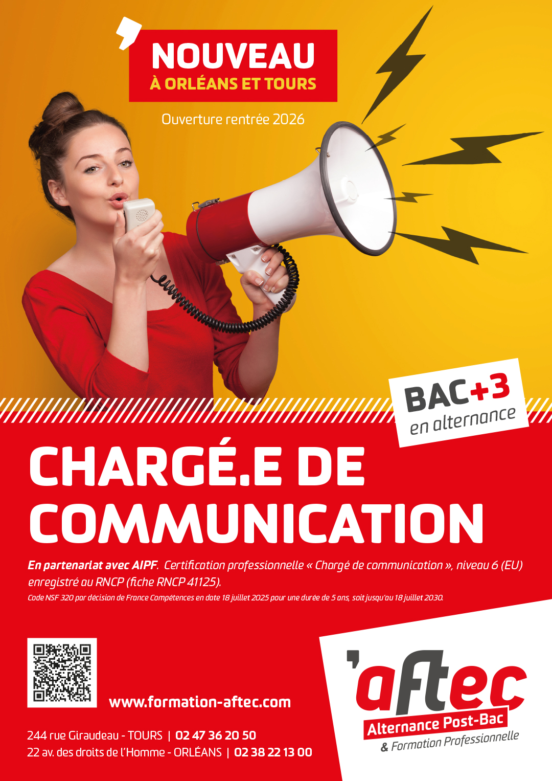 Certification professionnelle « Chargé de communication », niveau 6 (EU) enregistré au RNCP (fiche RNCP 41125). Code NSF 320 par décision de France Compétences en date 18 juillet 2025 pour une durée de 5 ans, soit jusqu’au 18 juillet 2030.